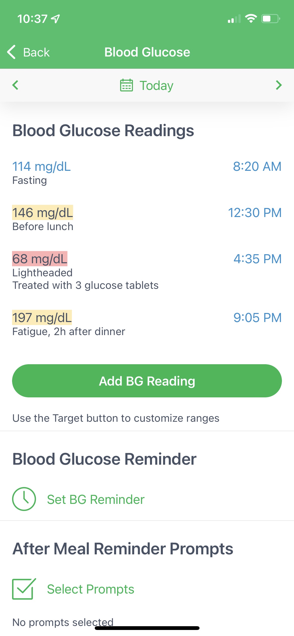 You can also select BG target ranges for each testing condition identified by a time period “label,” such as fasting, before lunch, after dinner, and before bed. The BG value will highlight in yellow if it is above your target range or red if it is below your target range. This allows you to identify high and low BGs on reports and charts quickly.