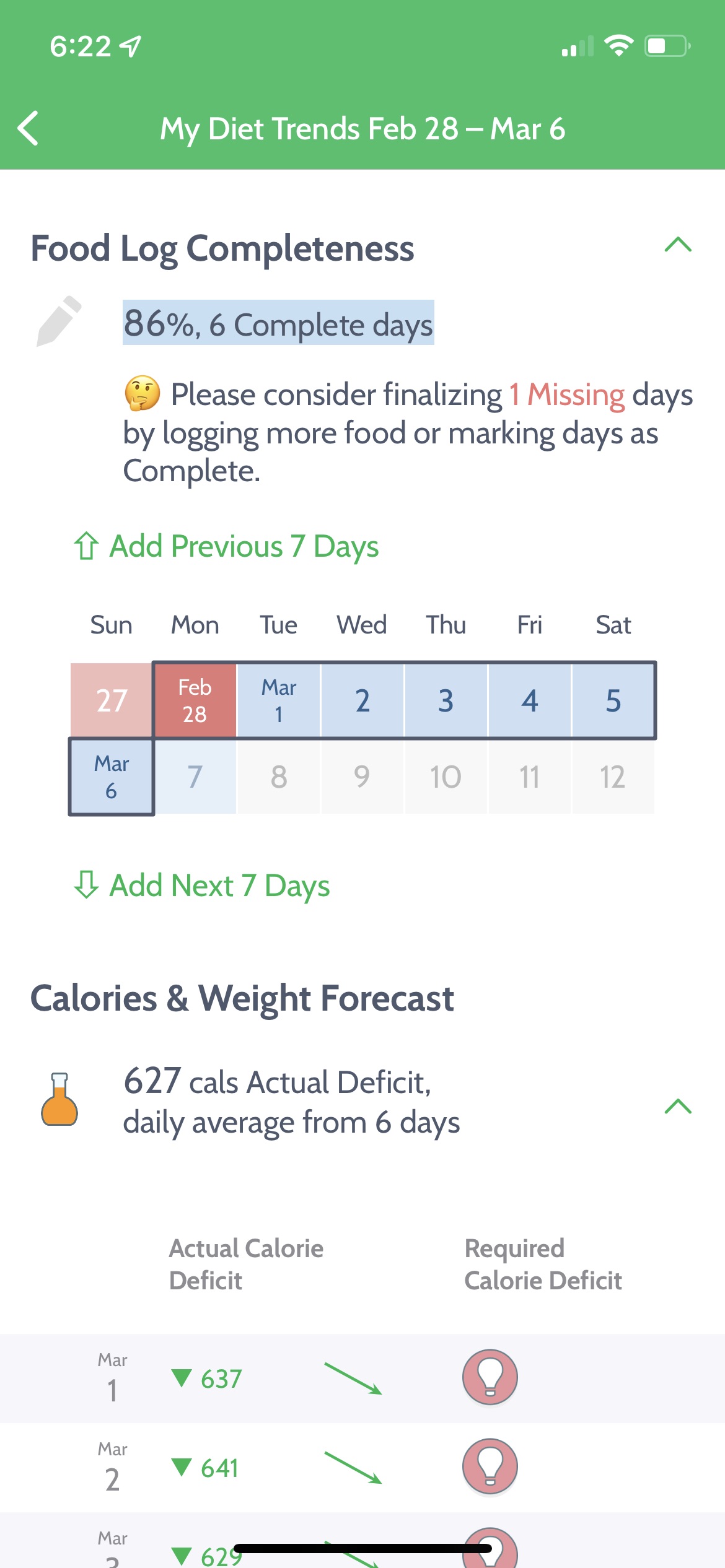 Note: You always have the opportunity to complete the logs by adding foods or manually marking days as complete.